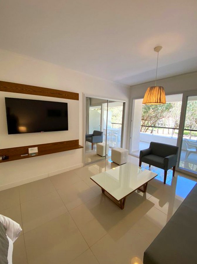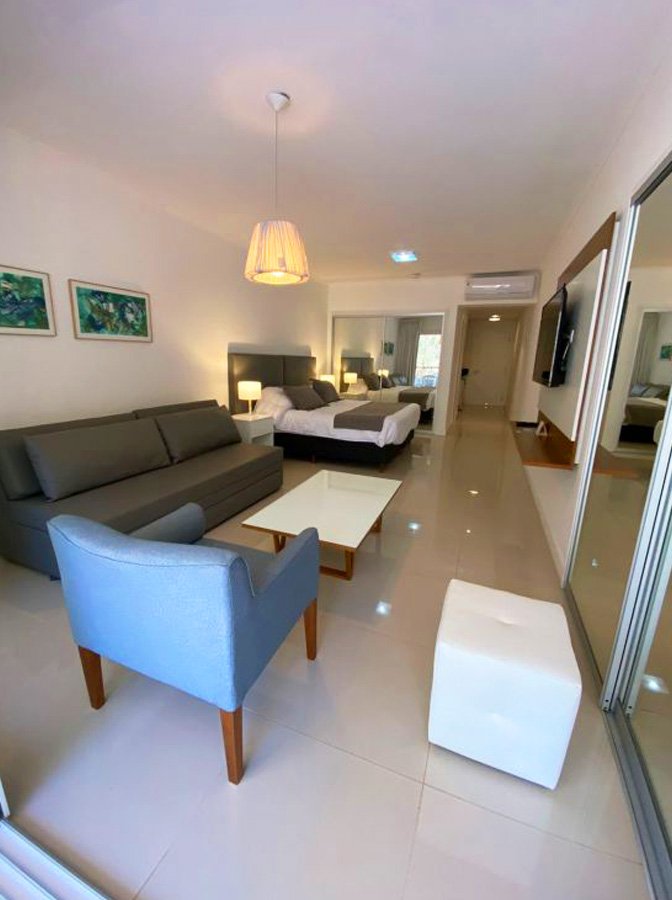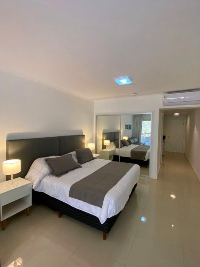 Este monoambiente, ubicado en la Torre N en el primer piso, ofrece una distribución inteligente y una luminosidad excepcional. Con capacidad para hasta 4 personas, cuenta con dos camas individuales que pueden unirse en una cama matrimonial y un sofá cama del que se despliegan dos camas individuales, garantizando comodidad para todos los huéspedes.