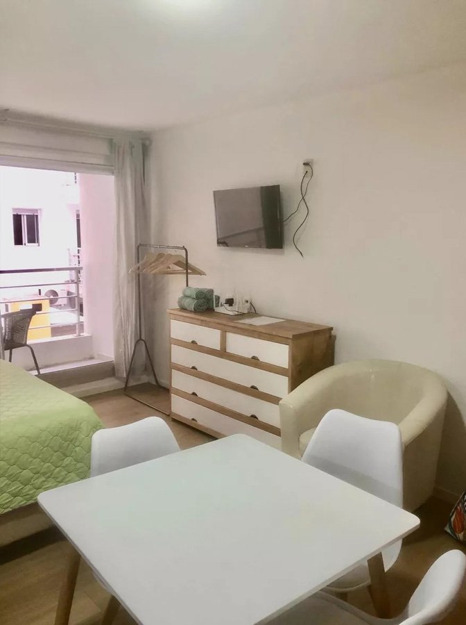 - Mesa para tres personas y TV con internet para entretenimiento y comodidad.